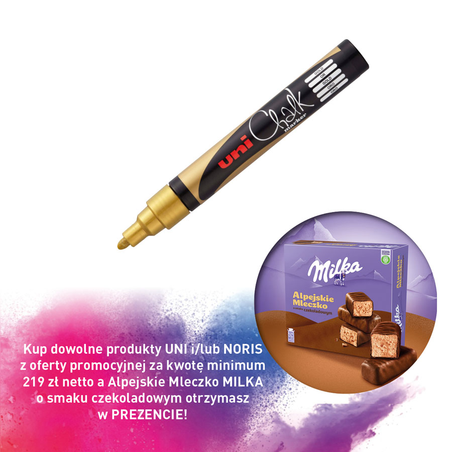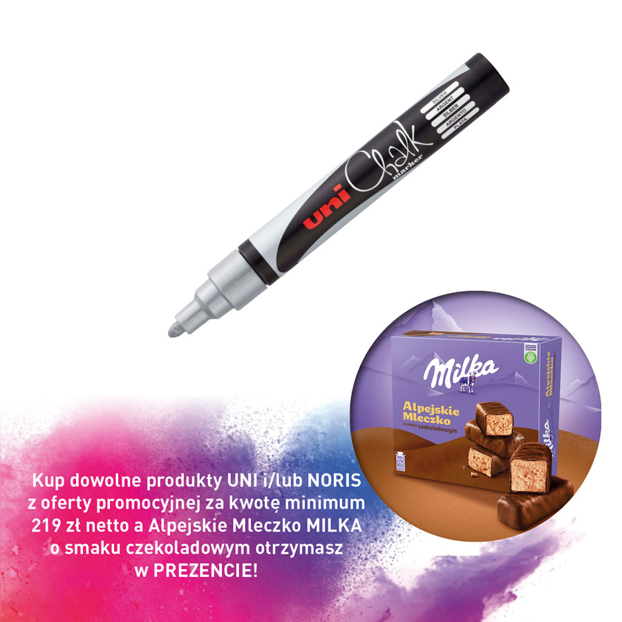 Kup dowolne produkty UNI i/lub NORIS z oferty promocyjnej za kwotę minimum 219 zł netto a Alpejskie Mleczko MILKA o smaku czekoladowym otrzymasz w PREZENCIE!