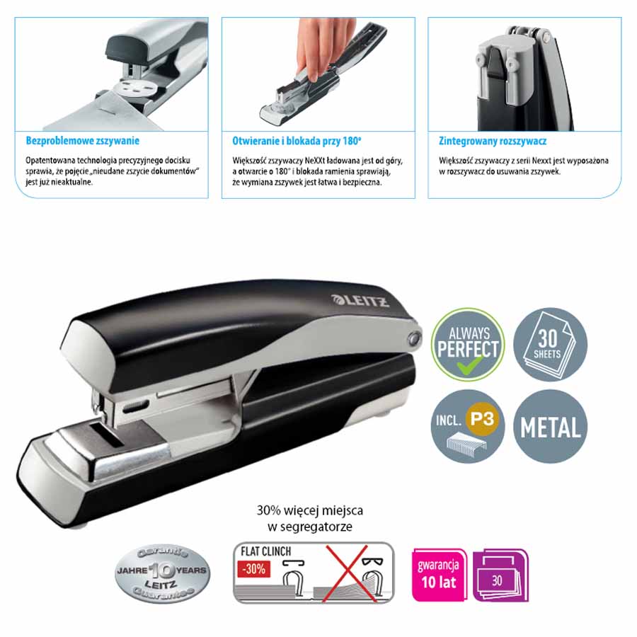- wymiana zszywek poprzez jednorazowe kasetki dla różnych wielkości plików kartek - od 2,5 do 8 mm