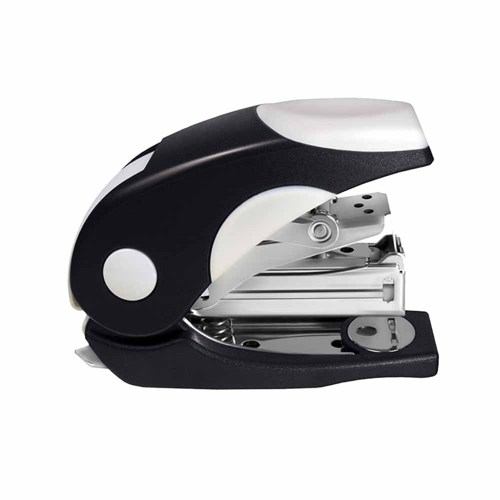 Ten dziurkacz wyposażony jest w opatentowane rozwiązanie – wgłębienie w tylnej części podstawy, które jest zgodne z rozstawem ringów w segregatorze. Umożliwia to szybkie dziurkowanie bez konieczności używania listwy formatowej, co znacząco przyspiesza pracę. Pojemnik na ścinki jest łatwy do opróżnienia, co zapewnia czystość i porządek na Twoim biurku, a ergonomiczna dźwignia z blokadą ułatwia przechowywanie.