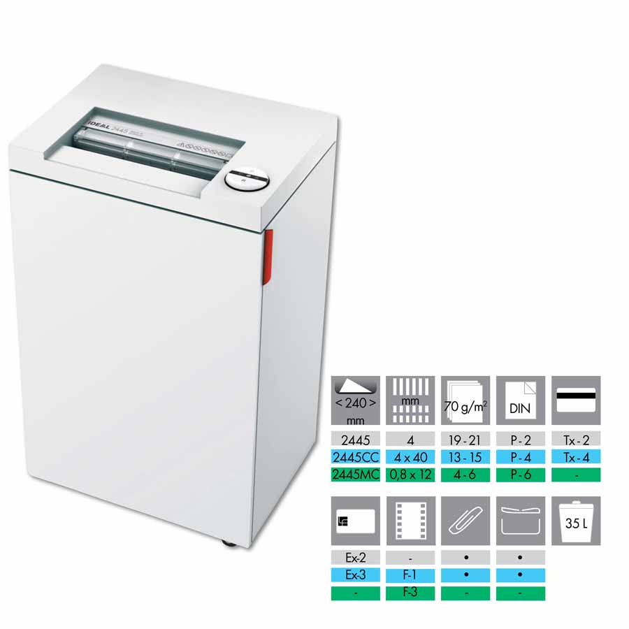 - SPS - System Zabezpieczeń: klapka zabezpieczająca szczelinę podawczą, automatyczne odcięcie zasilania przy otwartych drzwiczkach, automatyczne zatrzymanie przy zapełnieniu kosza, automatyczny rewers i docięcie zasilania w przypadku zacięcia papieru oraz podwójne zabezpieczenie silnika przed przegrzaniem