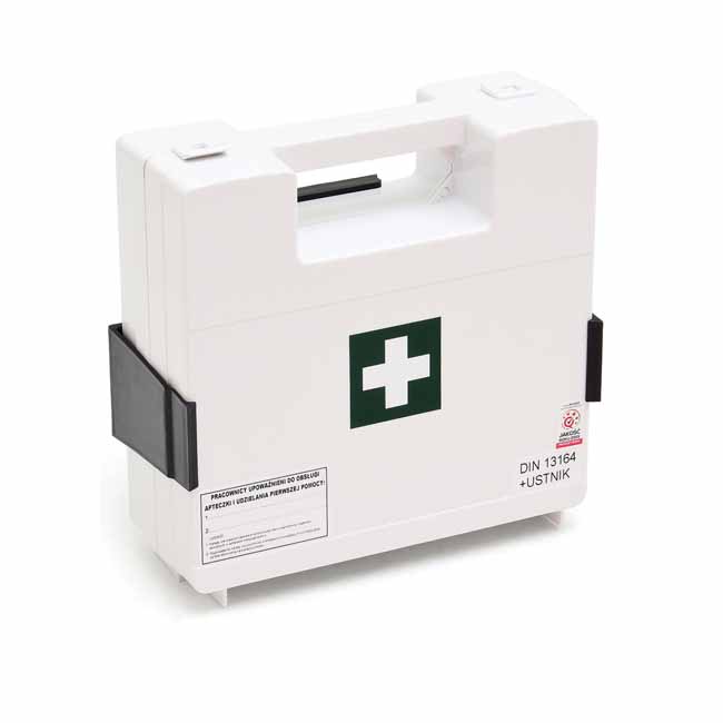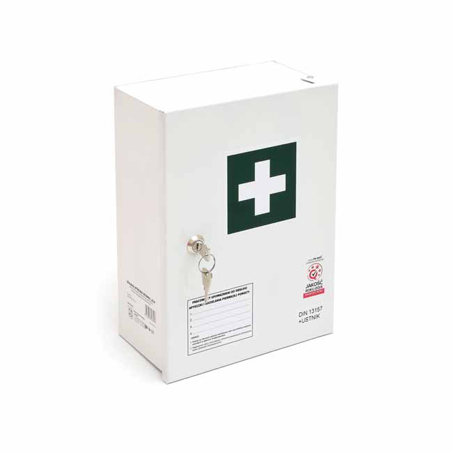 naścienna apteczka przeznaczona do zakładów pracy szafka metalowa wykonana z blachy stalowej malowanej farbą proszkową zamykana na klucz uchwyty do zamocowania na ścianie wyroby medyczne oznakowane znakiem CE apteczka spełnia wymagania norm Unii Europejskiej termin ważności produktów sterylnych wynosi 5 lat wyposażenie: DIN 13157 + aparat do sztucznego oddychania zawiera: - plaster na szpulce 5m x 2,5cm – 1 szt. - zestaw plastrów (5 rodzajów) – 42 szt./1 opak. - bandaż z kompresem (opatrunek indywidualny) 6cm x 8cm – 1 szt. - bandaż z kompresem (opatrunek indywidualny) 8cm x 10cm – 3 szt. - bandaż z kompresem (opatrunek indywidualny) 10cm x 12cm – 1 szt. - chusta opatrunkowa 60cm x 80cm – 1 szt. - kompres na rany 10cm x 10cm – 6 szt./3 opak. - kompres na oko 5cm x 7,5cm - 2 szt. - zimny kompres – 1 szt. - koc termiczny (ratunkowy) 210cm x 160cm – 1 szt. - bandaż elastyczny 4m x 6cm – 2 szt. - bandaż elastyczny 4m x 8cm – 2 szt. - chusta trójkątna 96cm x 96cm x 136cm – 2 szt. - nożyczki – 1 szt. - worek foliowy – 2 szt. - chusta z fizeliny 20cm x 30cm – 5 szt./1 opak. - chusteczki nasączone – 4 szt. - rękawiczki jednorazowe - 4 szt. (2 pary) - maska medyczna – 2 szt. - instrukcja udzielania pierwszej pomocy – 1 szt. - aparat do sztucznego oddychania - aparat do sztucznego oddychania wymiary: 360 mm x 220 mm x 120 mm kolor: biały