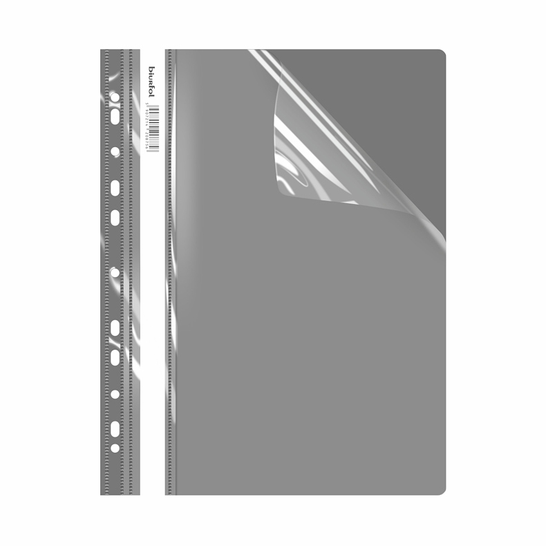 Przednia część skoroszytu to przezroczysta okładka o grubości 120 mic, umożliwiająca łatwe umieszczenie własnej etykiety lub strony tytułowej. Tylna okładka jest kolorowa i solidna (170 mic), co podkreśla elegancki wygląd i zapewnia stabilność całej konstrukcji.