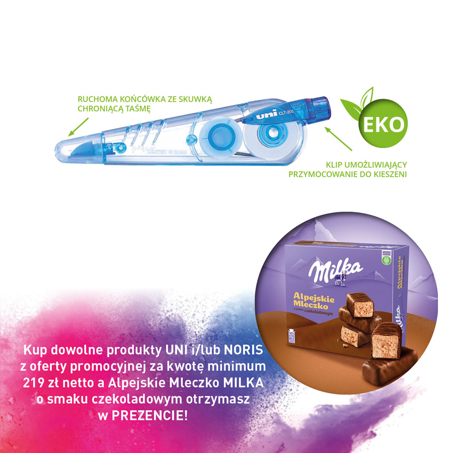 Kup dowolne produkty UNI i/lub NORIS z oferty promocyjnej za kwotę minimum 219 zł netto a Alpejskie Mleczko MILKA o smaku czekoladowym otrzymasz w PREZENCIE!