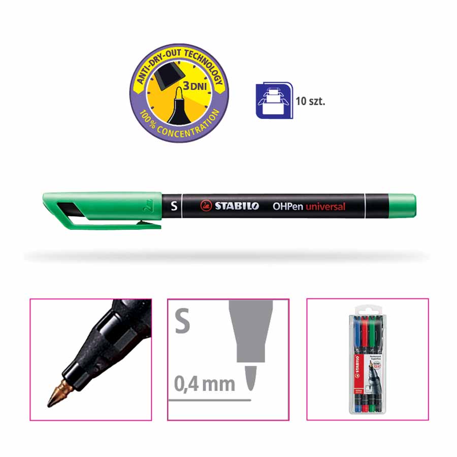 Foliopis STABILO OHPen M jest niezwykle wszechstronny, idealny do pisania na szkle, torebkach foliowych, etykietach, zdjęciach, błyszczącym papierze, płytach CD oraz zdjęciach rentgenowskich. Jego uniwersalność sprawia, że jest niezastąpiony w wielu sytuacjach.