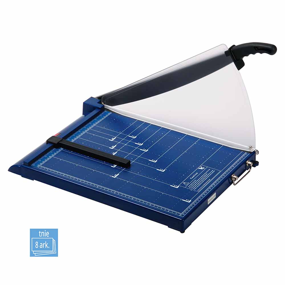 Urządzenie jest idealne do cięcia nie tylko papieru, ale także kartonu oraz cienkiej blachy. Dzięki standardowym szablonom formatów na blatach roboczych, ustawienie odpowiednich wymiarów jest szybkie i proste, co znacznie przyspiesza pracę. Gilotyna umożliwia jednorazowe cięcie do 12 kartek (70g), co czyni ją praktycznym narzędziem w codziennych zadaniach biurowych.