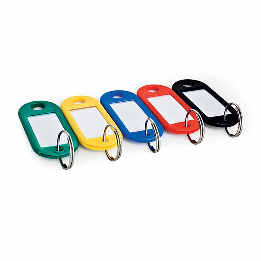 plastikowe zawieszki na klucze wyposażone w etykietkę opisową oraz kółeczko drugi otwór umożliwia dodatkowe przyłączenie klucza lub innej zawieszki rozmiar: 50x20mm 10 sztuk w j.s. kolor: biały